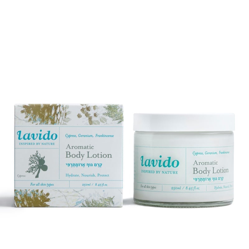 קרם גוף ארומתרפי ברוש, גרניום, לבונה, חמאת שיאה ושעוות דבורים Lavido.